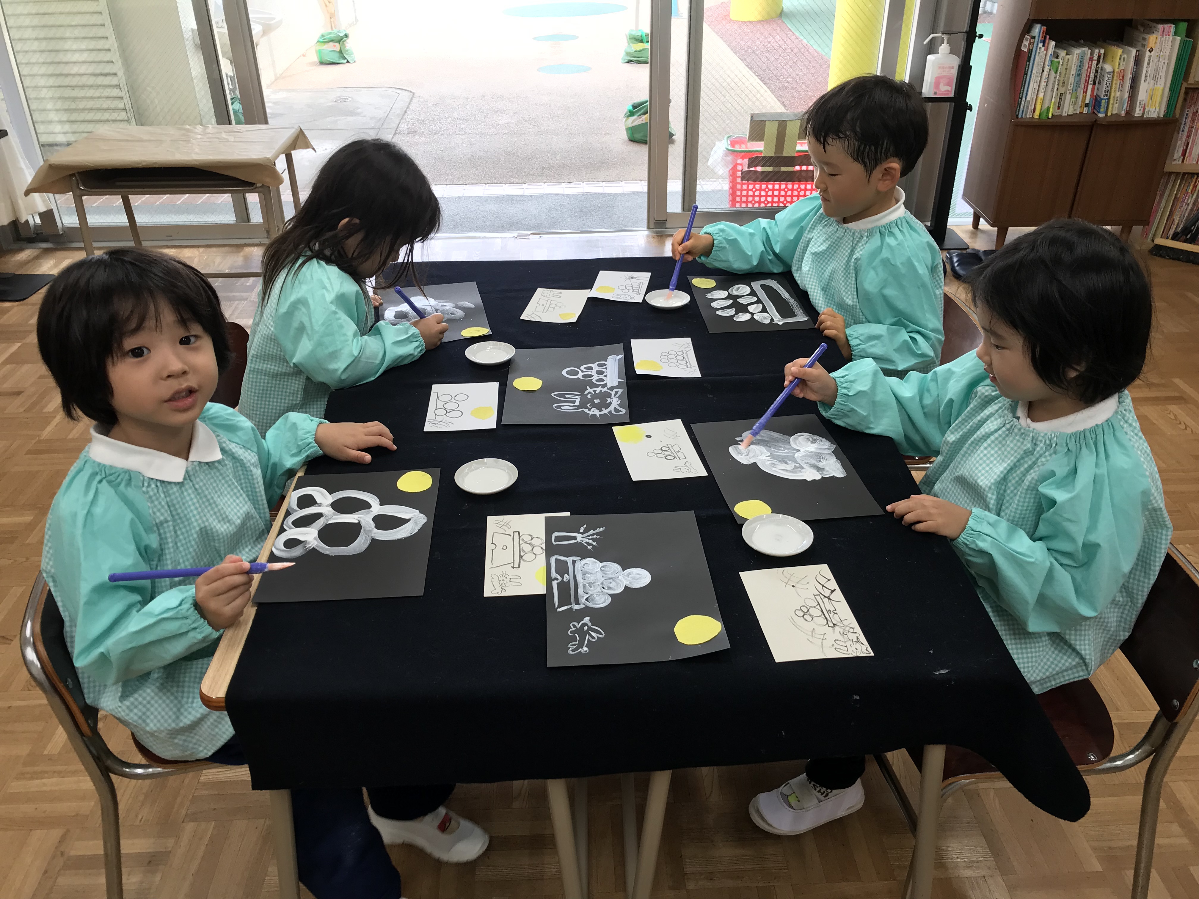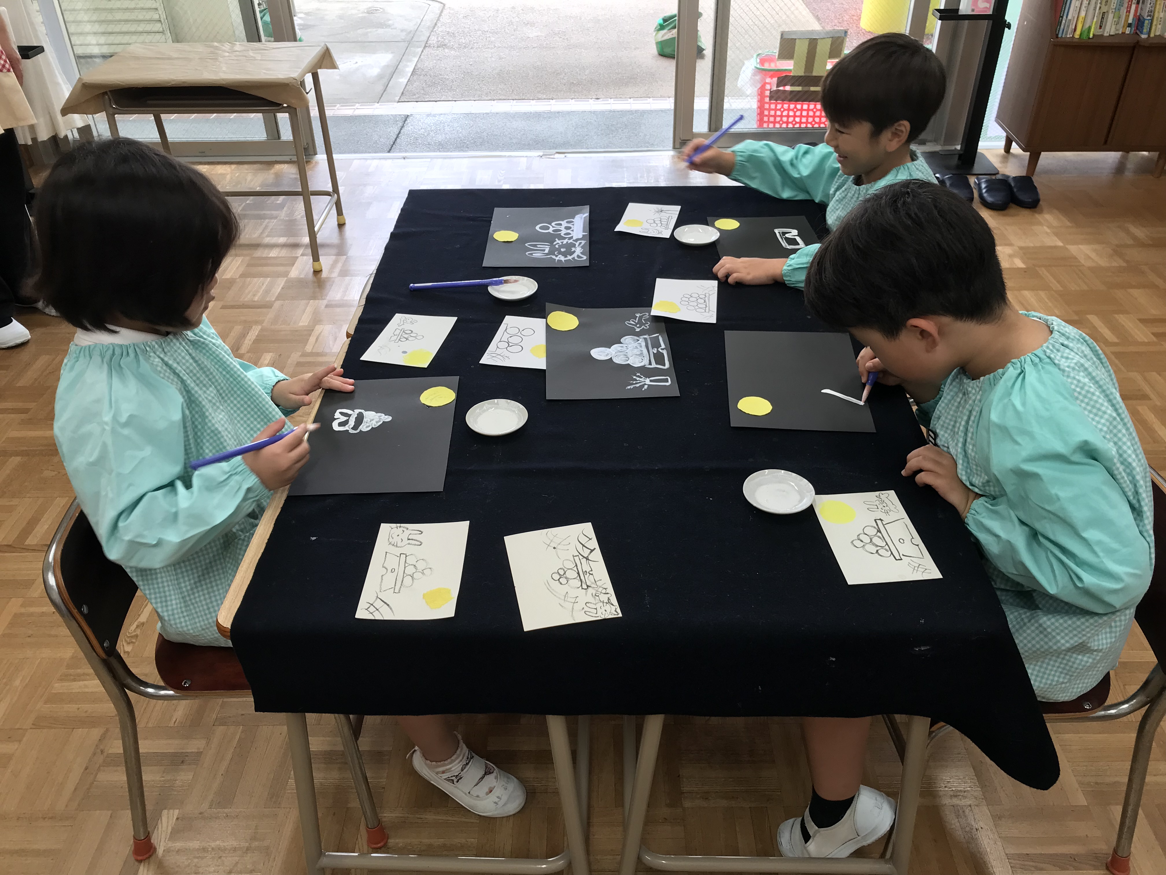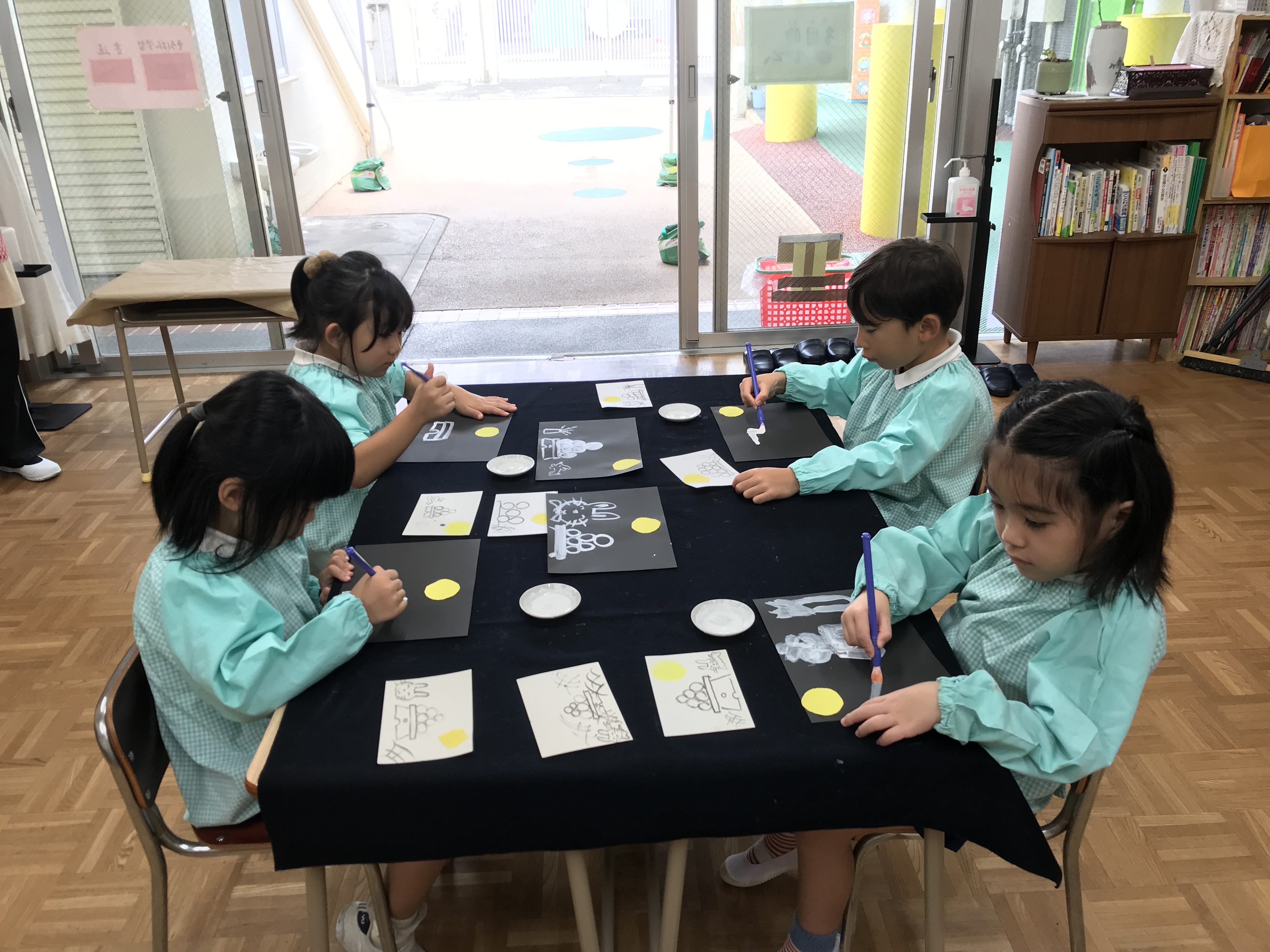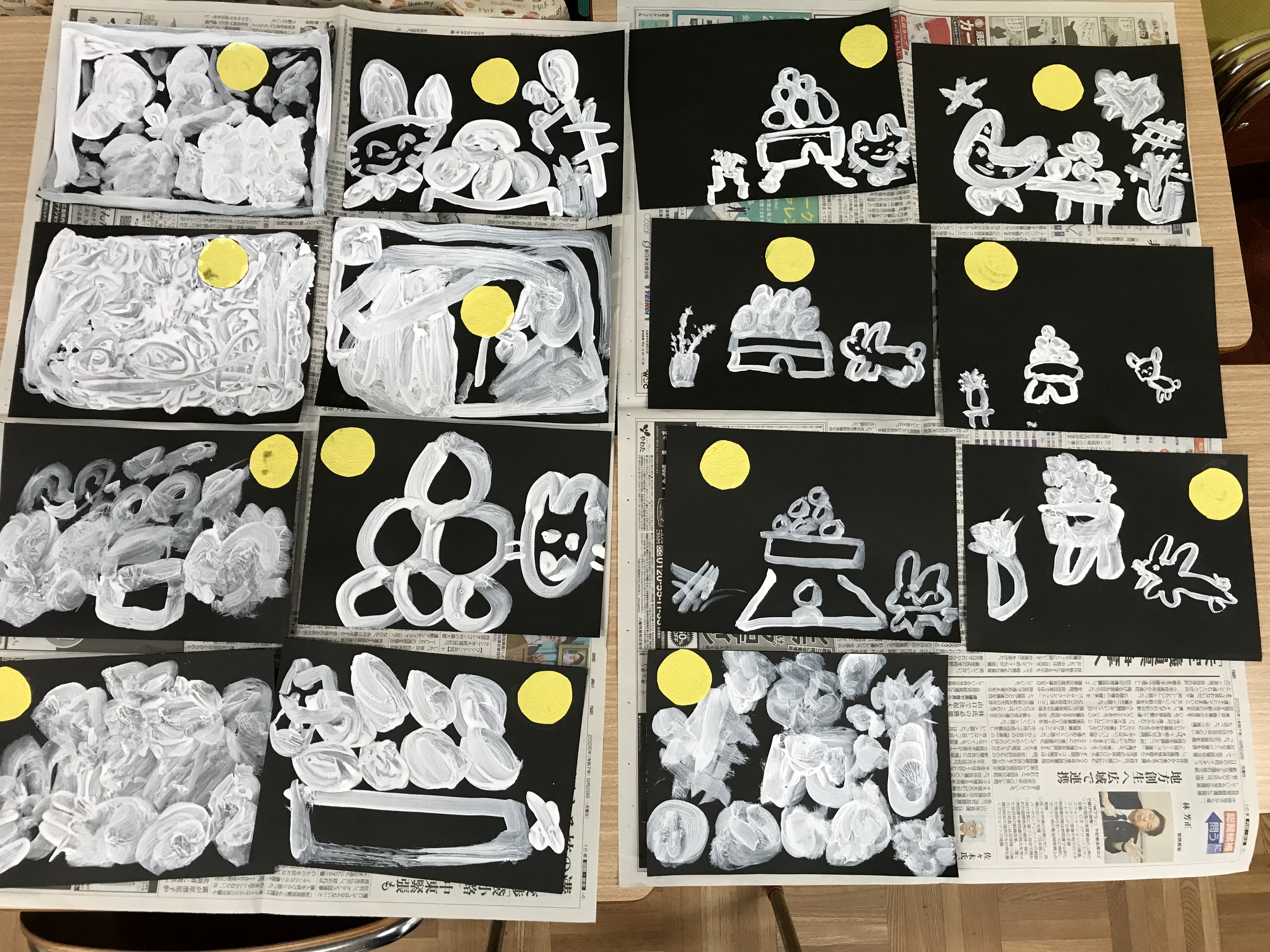 2025年10月02日 10月6日❓ 今年の10月6日は、中秋の名月🎑です。それで今日はみんなに白墨を使って、黒画用紙にお月見の絵を描いてもらいました。美味しそうなお団子をいっぱい描いたりと思い思いのお月見🌕の絵が完成しました。