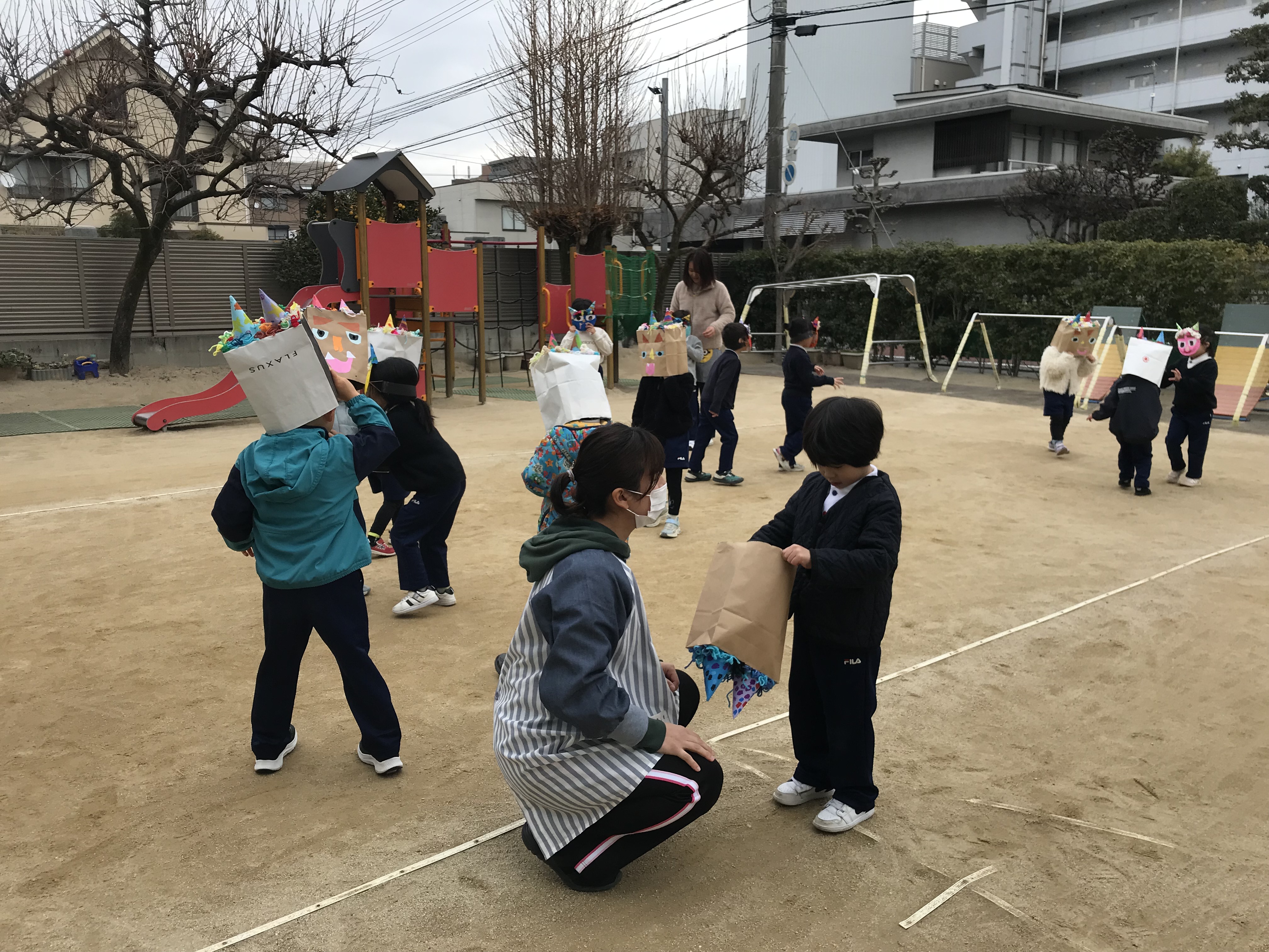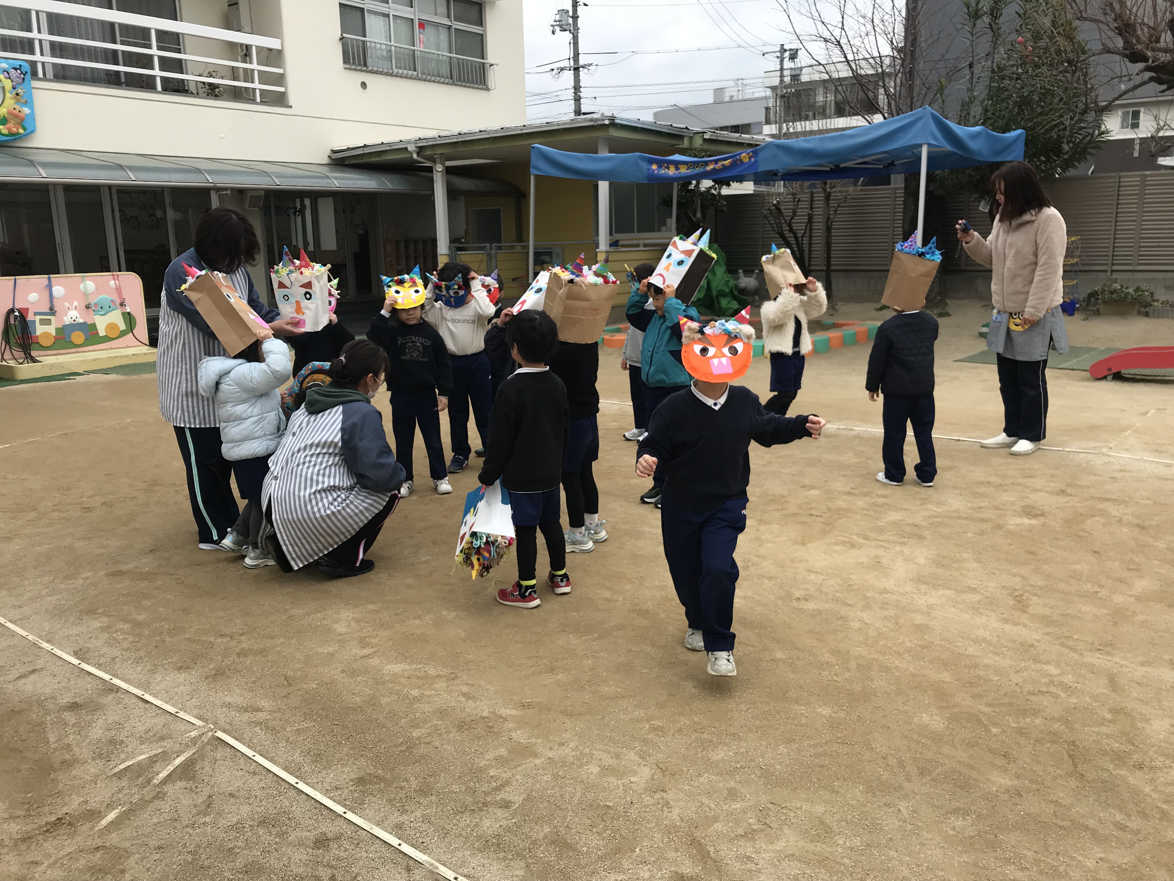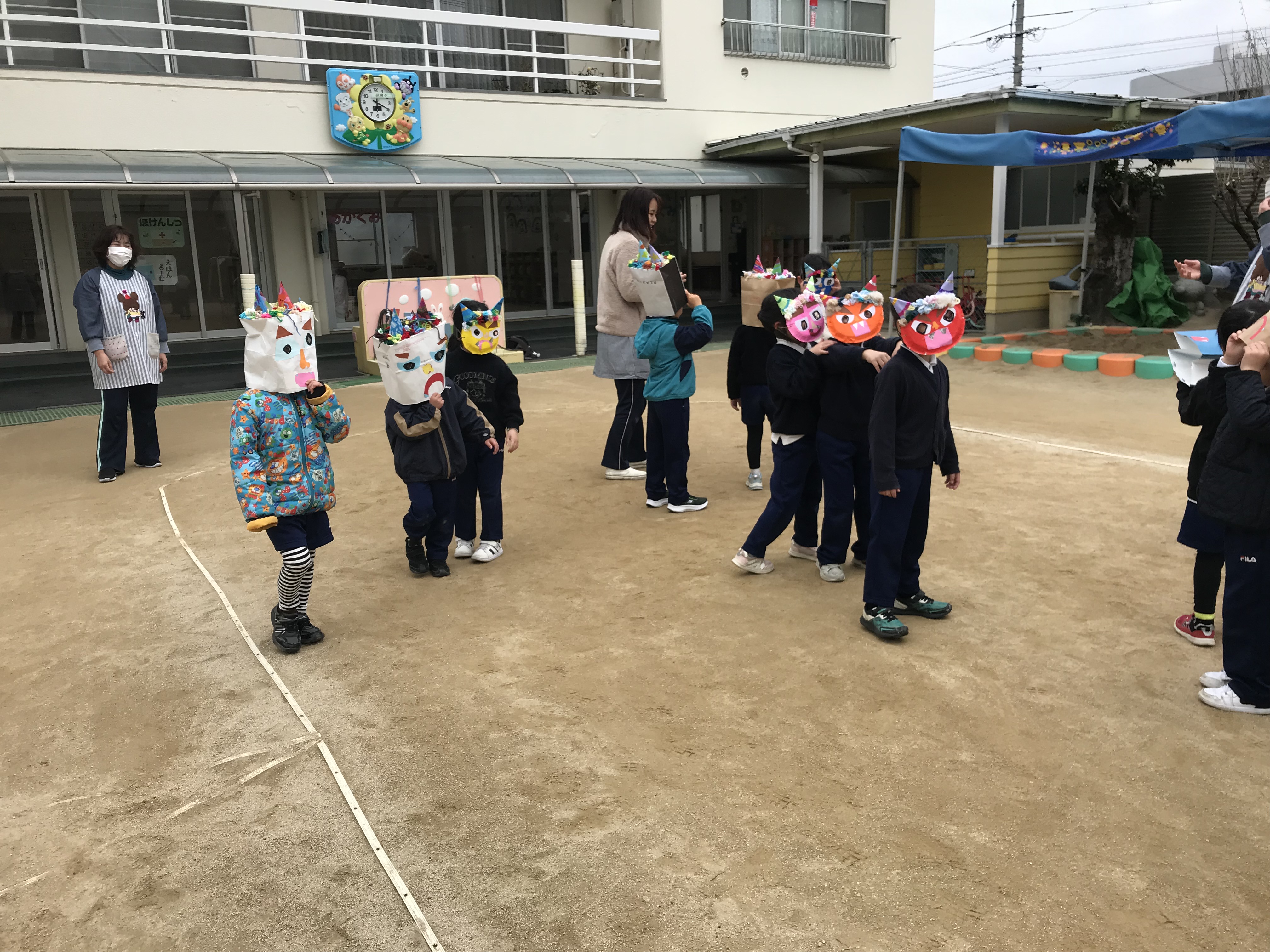 2026年02月03日 今日は節分👹 節分の行事がありました。自分が作った鬼のお面をつけて園庭で鬼たちが集まりました。教室では、豆まきの代わりにお菓子まきをして、心の鬼退治をしました。持ち帰った鬼のお面を使って楽しく鬼退治が出来たかな❓